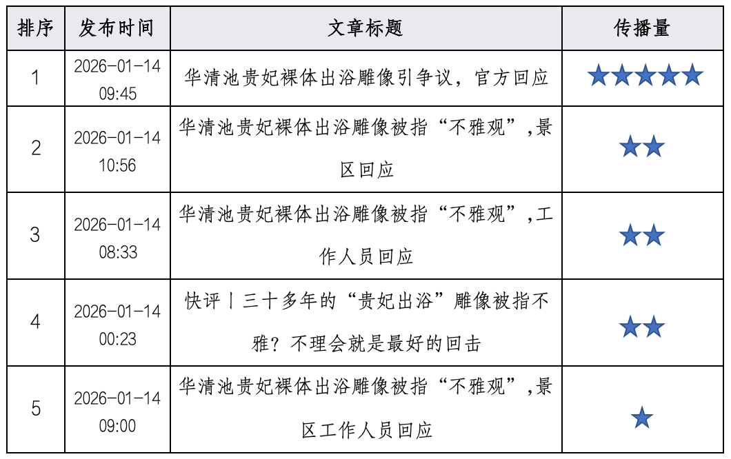 该时段内,有关“西安华清池贵妃出浴雕像被指不雅”媒体对此次事件的报道主要观点可归纳如下: