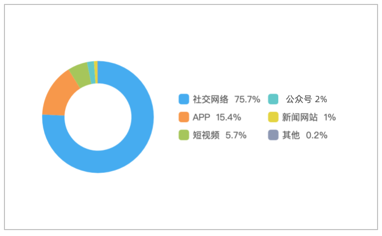 该时段内,境内有关“短剧选用11岁女童演替嫁新娘”的舆情主要集中在社交网络平台,相关舆情量约占总量的75.7%,其次为新闻APP约占15.4%,短视频约占5.7%。
