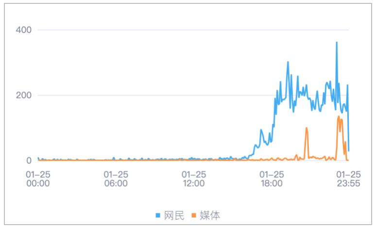 该时段内,境内有关“印度暴发尼帕病毒疫情”的舆情信息,媒体舆情于01月25日23时10分达到最高峰,网民舆情于01月25日23时00分达到最高峰。