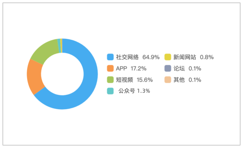 该时段内,境内有关“印度暴发尼帕病毒疫情”的舆情主要集中在社交网络平台,相关舆情量占总量的64.9%,其次为新闻APP占17.2%,短视频约占15.6%。