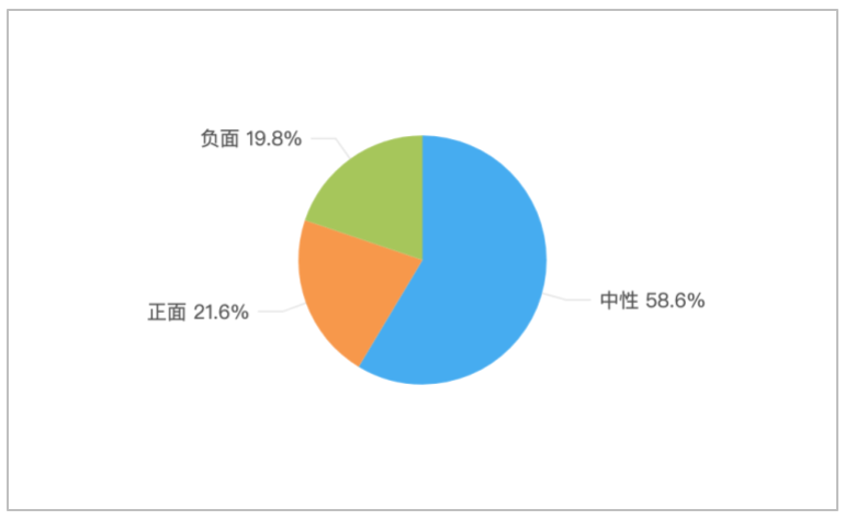 该时段内,境内有关“印度暴发尼帕病毒疫情”的舆情情感倾向中,中性舆情占比最多,达58.6%;其次是正面舆情,占比21.6%;负面舆情相对较少,占比19.8%。