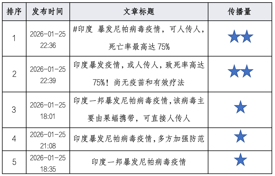 2026年01月25日00时至2026年01月26日00时,境内有关“印度暴发尼帕病毒疫情”的舆情信息主要传播平台为社交网络、新闻APP、短视频等。总体情感倾向以中性为主。其中,中性信息约占58.6%;正面信息约占21.6%;负面信息约占19.8%。舆情在01月25日23时达到最高峰。