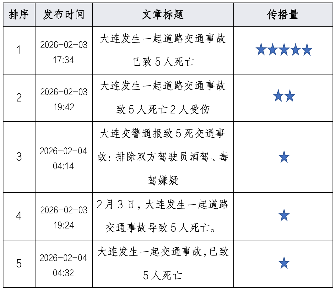 (一)关注事故基本情况与伤亡信息据【新华社】、【新京报】、【澎湃新闻】报道,多家媒体首要关注事件的核心事实,即大连金普新区发生一起严重道路交通事故,并造成5人死亡的悲剧性后果。这一观点集群侧重于对事件本身进行客观、及时的快讯式播报,通常引用官方部门或权威信源(如新华社“记者从有关部门获悉”),以伤亡人数、事发时间(2月3日)、地点(大连金普新区)等关键信息为传播重点,旨在第一时间向公众传递事件的基本轮廓和严重程度,满足公众对重大突发事件的信息需求,体现了媒体在突发事件初期报道中的信息传递功能。