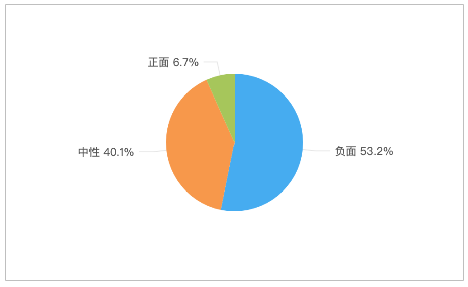 该时段内,境内有关“浙江夫妻网购娃娃菜食用中毒事件”的舆情中,负面情感倾向的舆情占比最多,达到53.2%;其次是中性舆情,占比40.1%;正面舆情较少,占比6.7%。