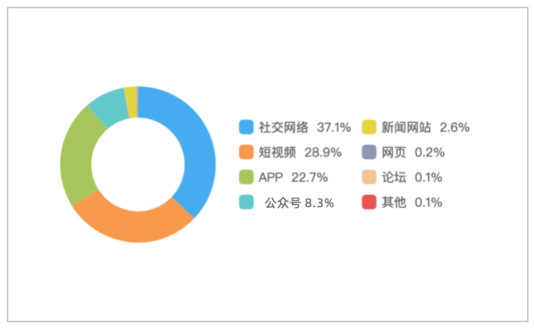 该时段内,境内有关“山西山阴一生物科技公司发生爆炸”的舆情主要集中在社交网络平台,相关舆情量约占总量的37.1%,其次为短视频约占28.9%,新闻APP约占22.7%。