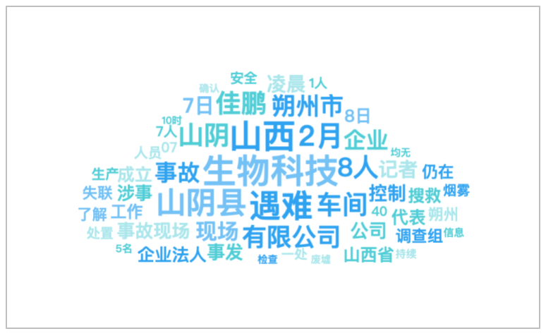 该时段内,有关“山西山阴一生物科技公司发生爆炸”的话题提及频次较高的词语有“生物科技”、“山西”、“遇难”、“山阴县”、“2月”等。