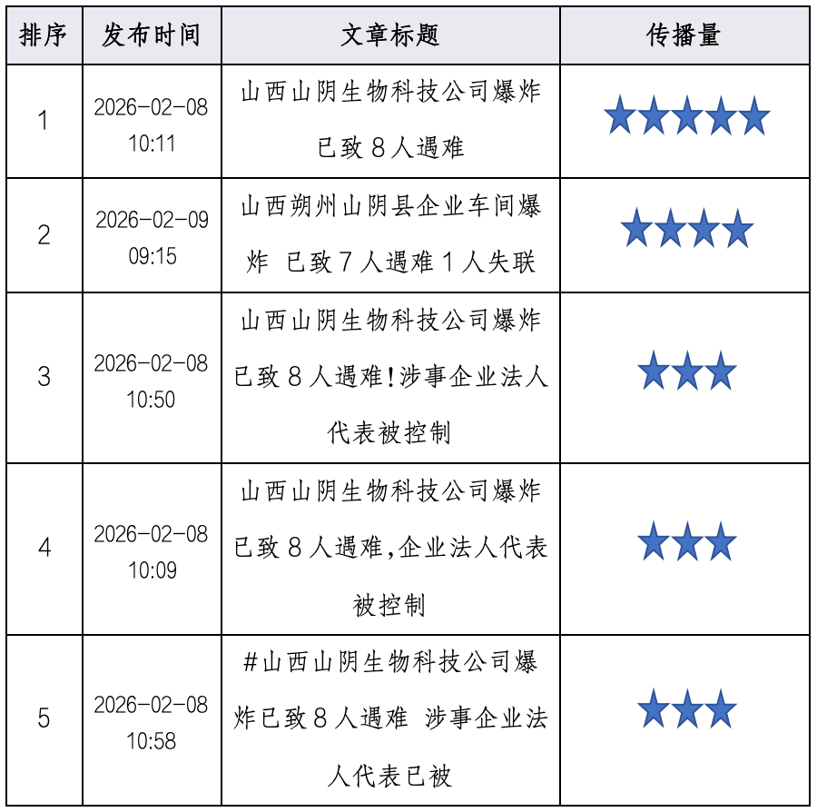 山西朔州山阴县佳鹏生物科技有限公司“2·07”爆炸事故已造成8人遇难,事件发生于春节前夕,迅速引发全国性舆论关注。当前舆情呈现官方信息发布及时、媒体集中报道事故进展、网络言论聚焦安全生产管理漏洞与基层监管责任等核心特征,舆情态势由事件通报向深度追问与反思阶段过渡。国务院安委办挂牌督办进一步提升了事件层级与公众期待。