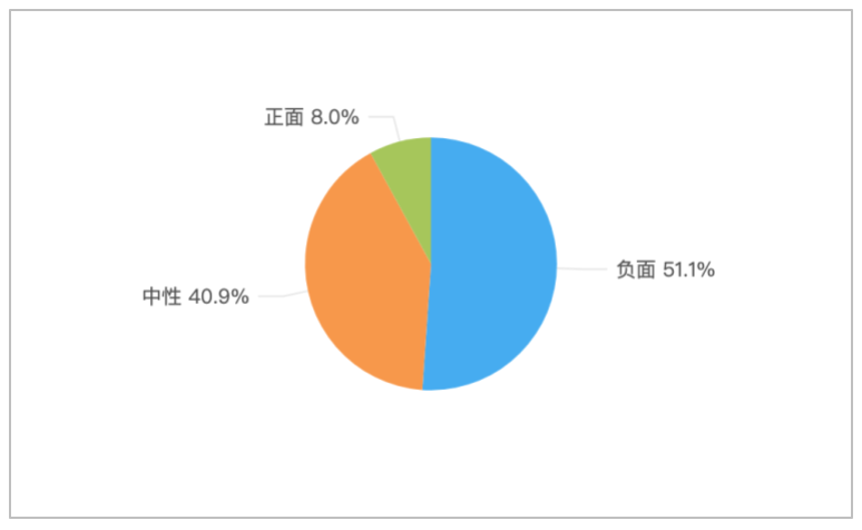 系统分析显示,在该时段内,境内有关“浙江体操运动员坠楼涉事教练被立案调查”的舆情情感倾向中,负面舆情占比51.1%,占比最高;其次为中性舆情,占40.9%;正面舆情占比最少,仅占8.0%。