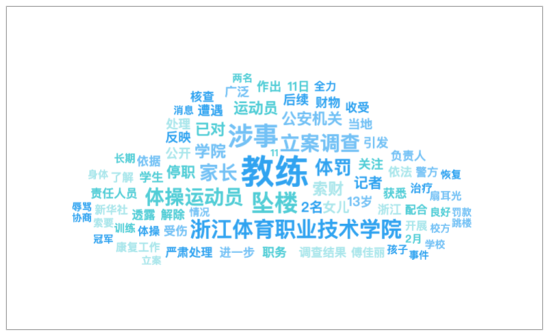 该时段内,有关“浙江体操运动员坠楼涉事教练被立案调查”的话题提及频次较高的词语有“教练”、“涉事”、“坠楼”、“浙江体育职业技术学院”、“立案调查”等。