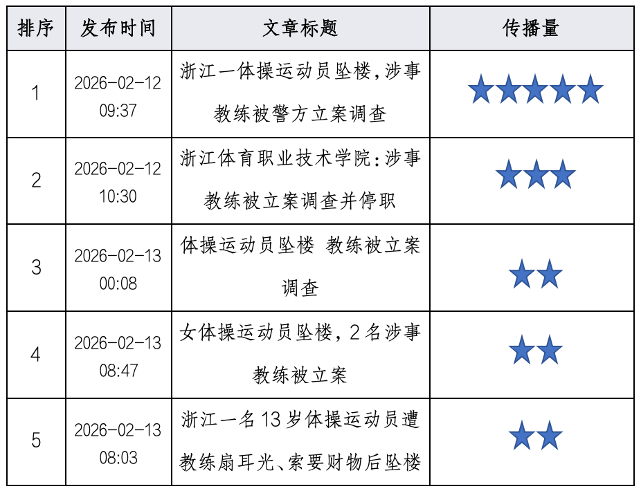 (一)关注事件进展与官方处置措施据【新华社】、【中国新闻周刊】、【南方都市报】报道,该集群观点核心在于通报事件最新进展及官方采取的初步措施。媒体报道均引述浙江体育职业技术学院官方消息,指出当地公安机关已对两名涉事教练立案调查,学院方面也已对涉事教练作出停职处理,并依据已核查的体罚学生、收受家长财物等问题,解除了其职务。报道强调,校方表示后续将根据公安机关的最终调查结果,对相关责任人员依法依规进一步严肃处理。同时,媒体也关注到受伤运动员的现状,指出学院正配合家长开展治疗康复,目前运动员身体恢复情况良好,校方与家长正在沟通后续事宜。这一集群的报道基调以客观陈述事实为主,侧重于传递官方声音和事件处理的程序性信息。