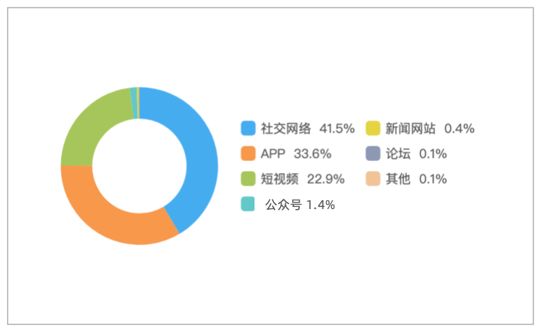 该时段内,境内有关“中戏两任表演系主任主动投案”的舆情主要集中在社交网络平台,相关舆情量约占总量的41.5%,其次为新闻APP约占33.6%,短视频约占22.9%。