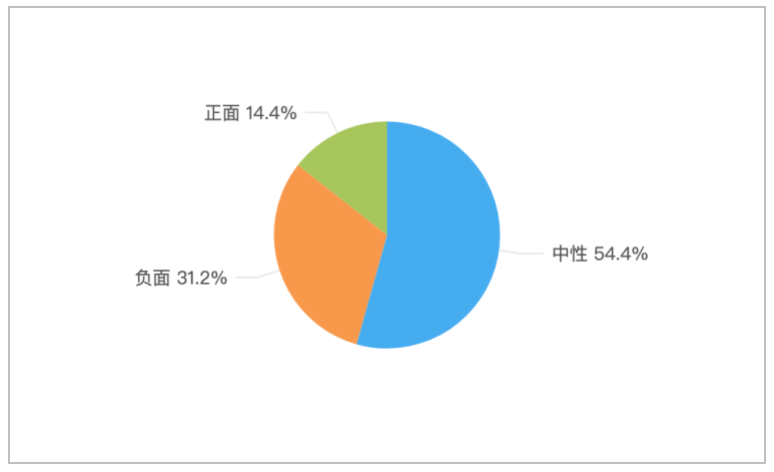 该时段内,境内有关“中戏两任表演系主任主动投案”的舆情情感倾向以中性为主,占比54.4%;负面舆情次之,约占比31.2%;正面舆情较少,约占比14.4%。