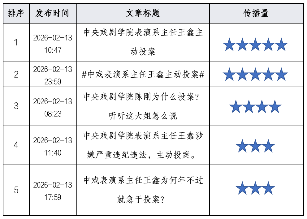 2026年02月13日00时至2026年02月14日09时,境内有关“中戏两任表演系主任主动投案”的舆情信息主要传播平台为社交网络、新闻APP、短视频等。总体情感倾向以中性为主。其中,中性信息约占54.4%;负面信息约占31.2%;正面信息约占14.4%。舆情在02月13日达到最高峰。