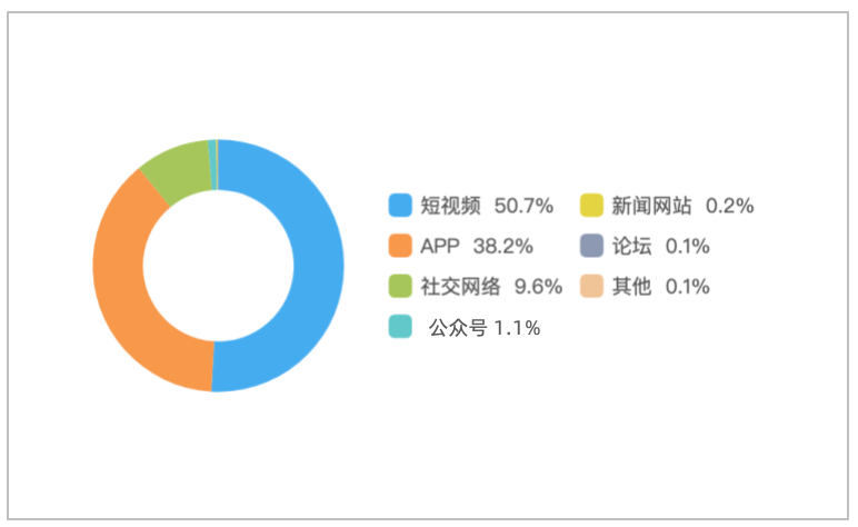 该时段内,境内有关“福建两学生帮扶老人遭索赔”的舆情主要集中在短视频平台,占总量的50.7%,其次为新闻APP占38.2%,社交网络占9.6%。