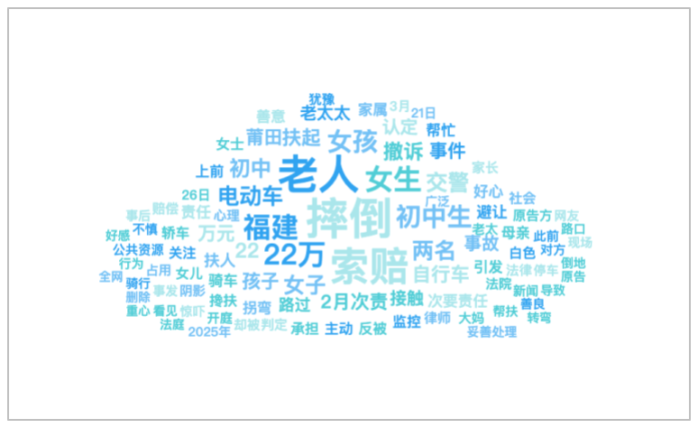 该时段内,有关“福建两学生帮扶老人遭索赔”的话题提及频次较高的词语有“摔倒”、“老人”、“索赔”、“女生”、“22万”等。
