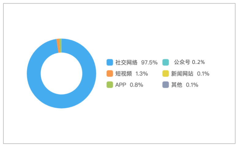 该时段内,境内有关“全国政协委员蒋胜男建议治理农村智障女性被迫结婚问题”的舆情主要集中在社交网络平台,相关舆情量约占总量的97.5%,其次为短视频约占1.3%,新闻APP约占0.8%。