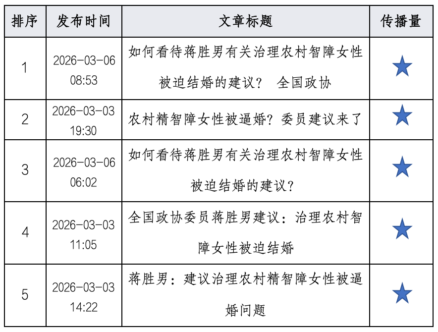该时段内,有关“全国政协委员蒋胜男建议治理农村智障女性被迫结婚问题”媒体对此次事件的报道主要观点可归纳如下: