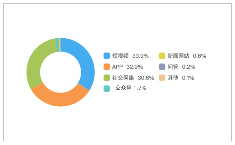 该时段内,境内有关“武汉一男子被困核磁共振室6小时”的舆情主要集中在短视频平台,相关舆情量约占总量的33.9%,其次为新闻APP约占32.9%,社交网络约占30.6%。
