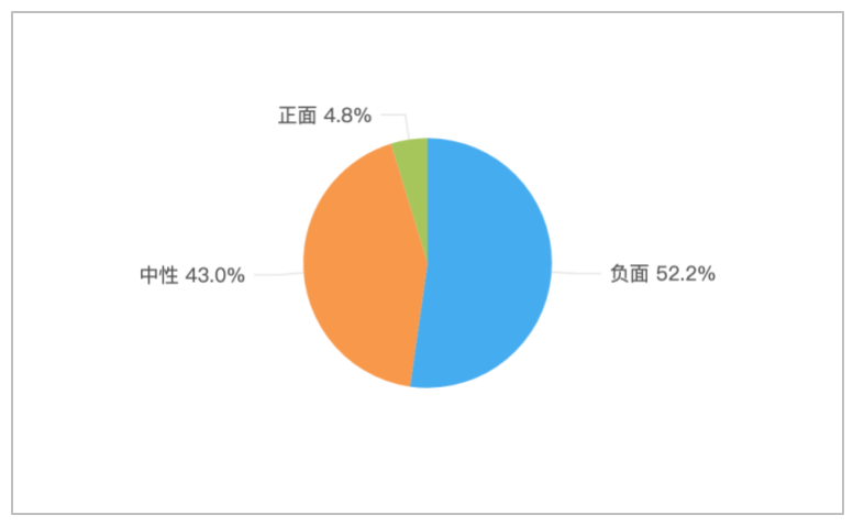 该时段内,关于“武汉一男子被困核磁共振室6小时”的舆情情感倾向中,负面舆情占比最多,为52.2%;中性舆情次之,占43.0%;正面舆情占比最少,仅为4.8%。