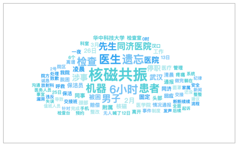 该时段内,有关“武汉一男子被困核磁共振室6小时”的话题提及频次较高的词语有“核磁共振”、“医生”、“6小时”、“遗忘”、“机器”等。