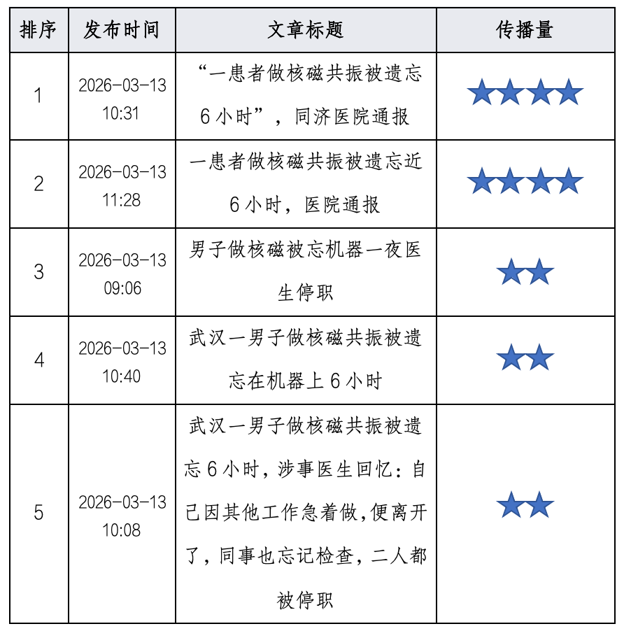 华中科技大学同济医学院附属同济医院“患者被遗忘核磁共振机6小时”事件,因情节离奇、触及医疗安全底线,经媒体报道后迅速引爆舆情。当前舆情呈现高热态势,公众情绪以震惊、愤怒为主,核心矛头直指医院管理漏洞与医护人员责任心缺失。尽管院方已发布通报承认错误并公布停职、整改等初步措施,但“赔偿未谈拢,建议患者起诉”的处置方式引发次生舆情,加剧了公众对医院诚意与责任担当的质疑,舆情焦点从单一事件向医院整体管理水平、医患信任危机等深层次问题扩散。