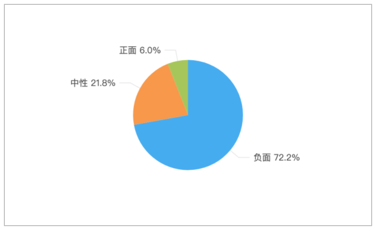 该时段内,关于“湖南某医院一失联研究生坠江离世”的舆情中,负面情感倾向的舆情占比最多,达到72.2%;中性舆情次之,占比21.8%;正面舆情较少,占比仅6.0%。