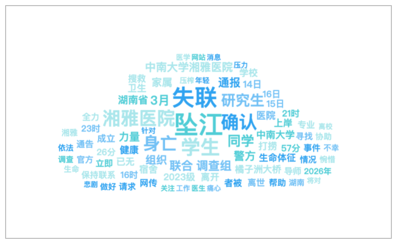 该时段内,有关“湖南某医院一失联研究生坠江离世”的话题提及频次较高的词语有“坠江”、“失联”、“学生”、“某医院”、“确认”等。