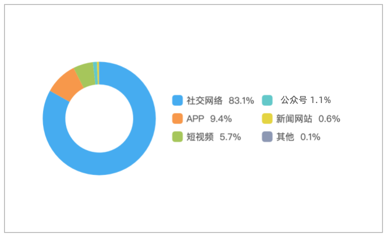 该时段内,境内有关“湖南某医院一失联研究生坠江离世”的舆情主要集中在社交网络平台,相关舆情量约占总量的83.1%,其次为新闻APP约占9.4%,短视频约占5.7%。