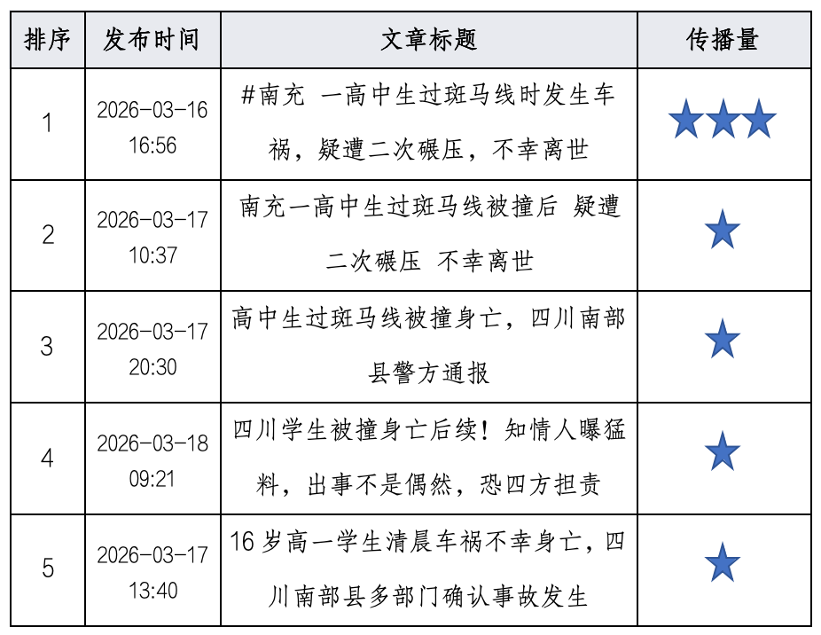 2026年03月16日00时至2026年03月18日13时,境内有关“四川南充一高中生过马路被撞身亡”的舆情信息主要传播平台为短视频、社交网络、新闻APP等。总体情感倾向以负面为主。其中,负面信息约占59.9%;中性信息约占36.6%;正面信息约占3.5%。舆情在03月17日达到最高峰。