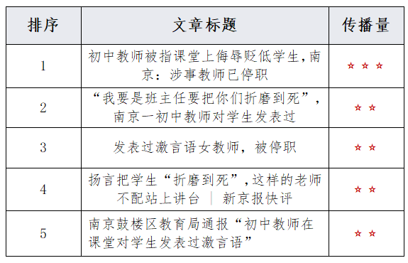 由上图可以看出,有关“南京一教师被指课堂上贬低学生”的舆情情感倾向中,负面舆情占比最多,达57.4%;其次是中性舆情,占37.3%;正面舆情占比最少,仅5.3%。