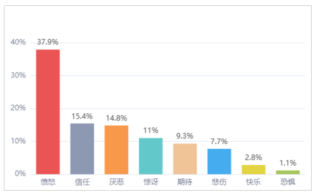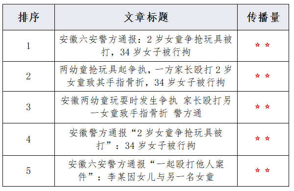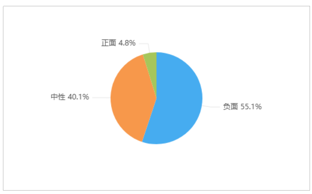 由上图可以看出,“安徽两岁女童争抢玩具被打”相关舆情的情感倾向中,负面舆情占比最多,为55.1%;其次是中性舆情,占比40.1%;正面舆情占比最少,仅为4.8%。