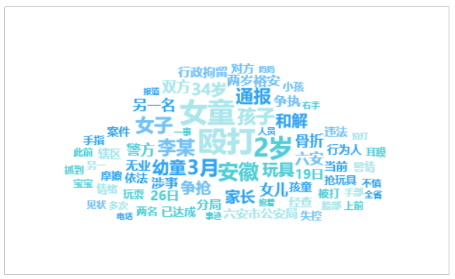 由上图可以看出,有关“安徽两岁女童争抢玩具被打”的话题提及频次较高的词语有“殴打”、“女童”、“2岁”、“安徽”、“3月”等。