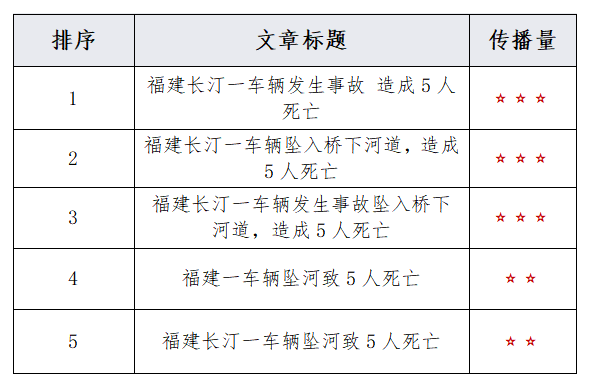 由上图可以看出,有关“福建一车辆坠河致5人死亡”的话题提及频次较高的词语有“5人”、“车辆”、“死亡”、“事故”、“坠河”等。