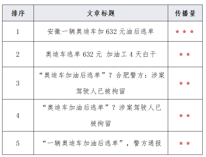 由上图可以看出,有关“一奥迪车在合肥加完油后逃单”的舆情中,负面情感倾向的舆情占比最多,达51.3%;中性舆情次之,占比43.3%;正面舆情较少,仅占5.4%。