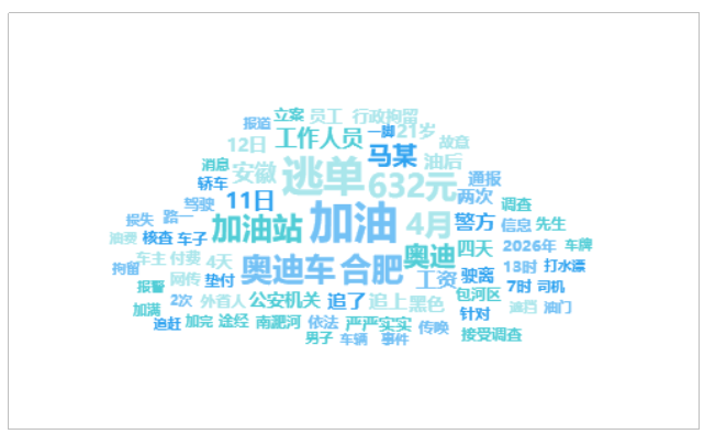 由上图可以看出,有关“一奥迪车在合肥加完油后逃单”的话题提及频次较高的词语有“加油”、“逃单”、“合肥”、“632元”、“奥迪车”等。