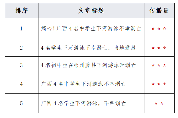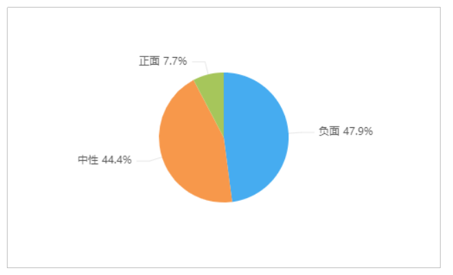 由上图可以看出,关于“广西4名学生下河游泳溺亡”的舆情情感倾向中,负面舆情占比最多,达到47.9%;其次是中性舆情,占比44.4%;正面舆情较少,占比为7.7%。