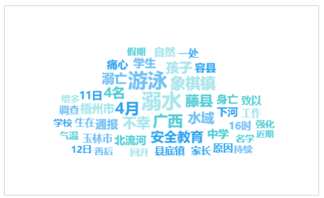 由上图可以看出,有关“广西4名学生下河游泳溺亡”的话题提及频次较高的词语有“溺水”、“游泳”、“广西”、“象棋镇”、“4月”等。