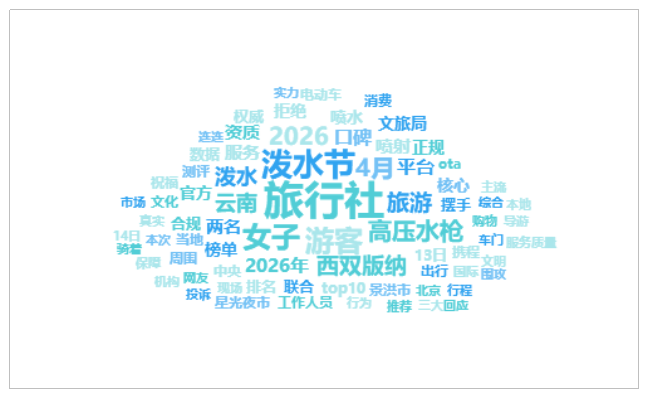 由上图可以看出,有关“云南泼水节不文明行为事件”的话题提及频次较高的词语有“旅行社”、“泼水节”、“游客”、“女子”、“4月”等。