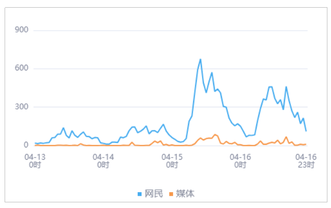 由上图趋势可以看出,有关“云南泼水节不文明行为事件”的媒体舆情于04月15日15时达到最高峰,网民舆情于04月15日10时达到最高峰。