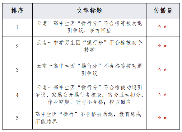 由上图可以看出,有关“云南高中生因操行分被劝退”的话题提及频次较高的词语有“学校”、“操行分”、“劝退”、“学生”、“不合格”等。
