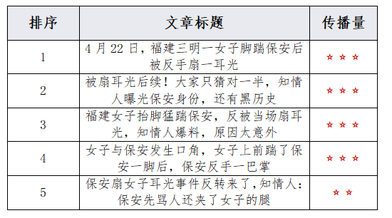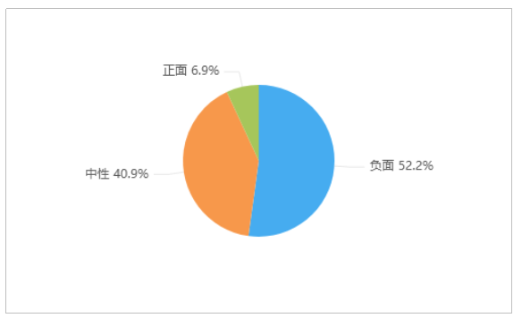 由上图可以看出,有关“福建三明一保安在停车场掌掴女子”舆情,负面情感倾向为主导,占比达52.2%;中性舆情次之,占比40.9%;正面舆情占比较少,仅为6.9%。