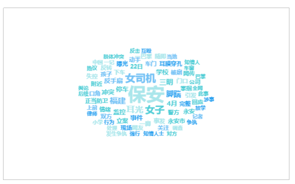 由上图可以看出,有关“福建三明一保安在停车场掌掴女子”的话题提及频次较高的词语有“保安”、“女司机”、“女子”、“耳光”、“福建”等。