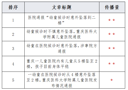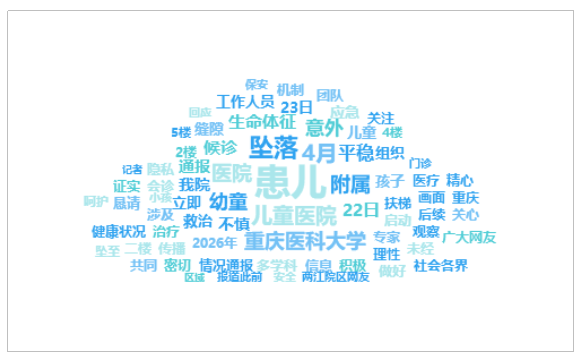 由上图可以看出,有关“重庆一医院有幼童候诊时意外坠落”的话题提及频次较高的词语有“患儿”、“坠落”、“4月”、“儿童医院”、“医院”等。