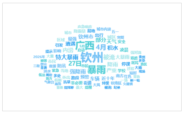 由上图可以看出,有关“广西钦州大暴雨致多地严重内涝”的话题提及频次较高的词语有“钦州”、“广西”、“暴雨”、“4月”、“27日”等。