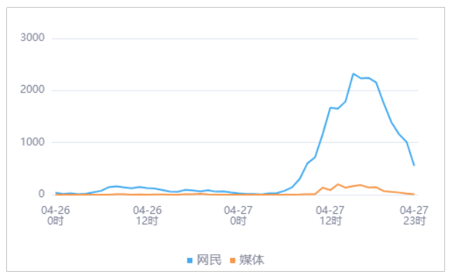 由上图趋势可以看出,有关“广西钦州大暴雨致多地严重内涝”的媒体舆情于04月27日13时达到最高峰,网民舆情于04月27日15时达到最高峰。